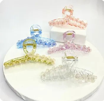 Gancho para el cabello decorado con esferas tipo perla translúcidas en tonos pastel. Su diseño elegante y resistente ofrece una sujeción firme mientras añade un toque delicado y sofisticado a tus peinados diarios.
