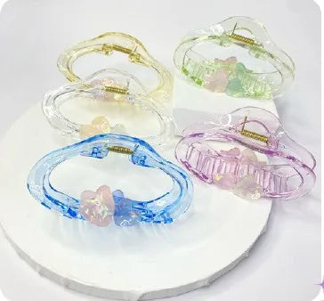 Gancho para el cabello en forma de nube, decorado con delicadas flores en tonos pastel. Su diseño transparente y colorido lo convierte en el accesorio perfecto para dar un toque tierno y femenino a tus peinados diarios.