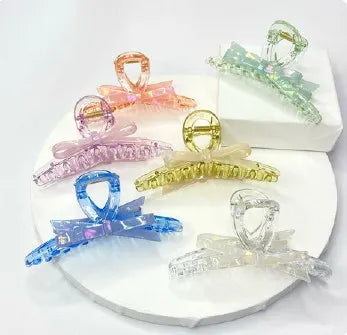 Gancho para el cabello con diseño de lazo y acabado tornasol en tonos pastel. Ideal para darle a tus peinados un toque dulce, elegante y moderno, asegurando firmeza y estilo en cualquier ocasión.